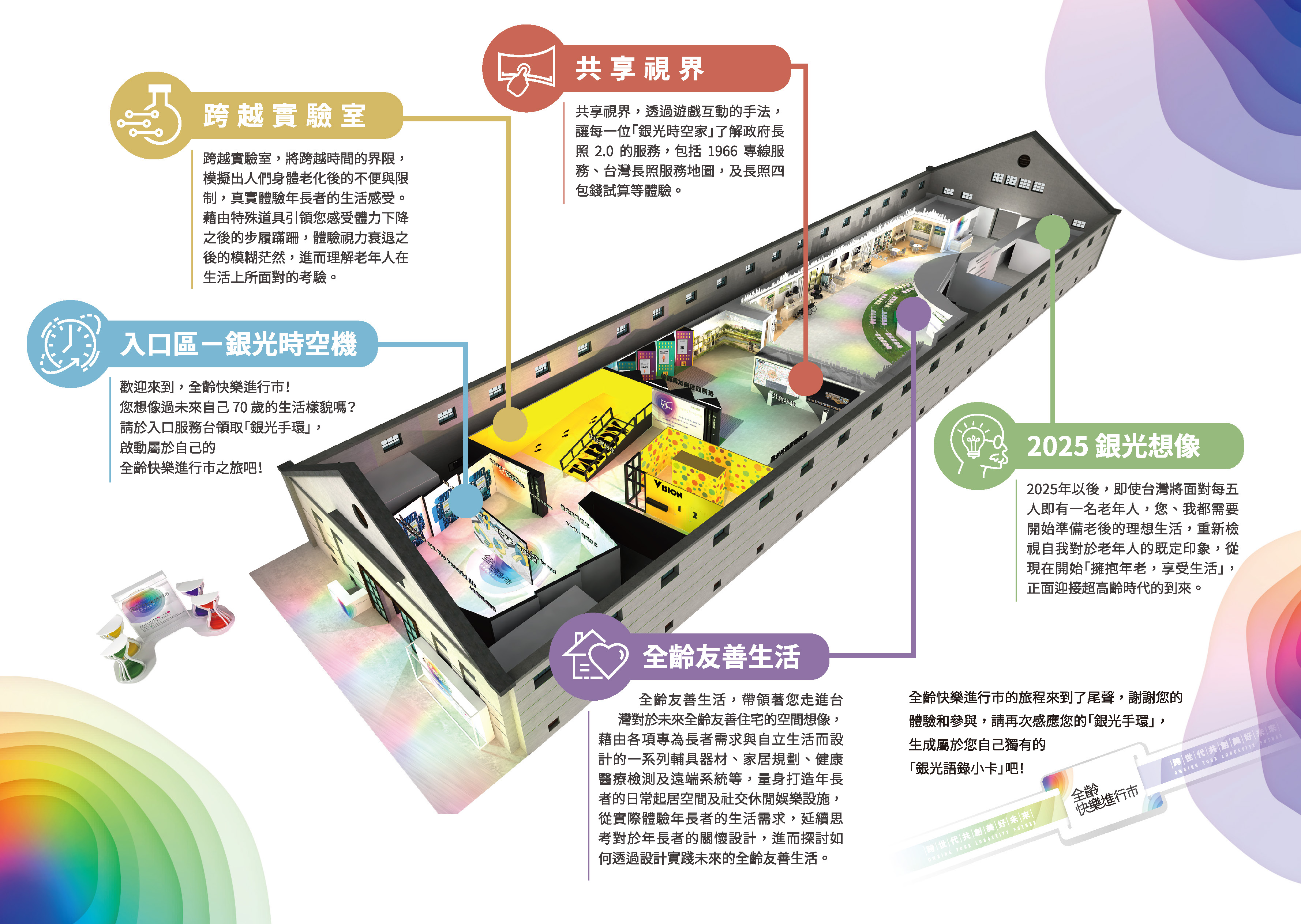 本展覽之展區規劃為5大區域,包含1.)入口區-銀光時空機,領取您的「時光手環」並體驗變老拍照;2.)跨越實驗室-體驗體力下降及視力模糊之老化限制;3.)共享視界-了解政府長照2.0之服務,如長照服務地圖、長照四包錢之計算了解長照2.0能幫您省多少錢等;4.)全齡友善生活-體驗專為長者自立生活之關懷設計,如日常起居空間及休閒娛樂設施;5.)2025銀光想像,蒐集觀展回饋,並獲得專屬的未來語錄小卡。