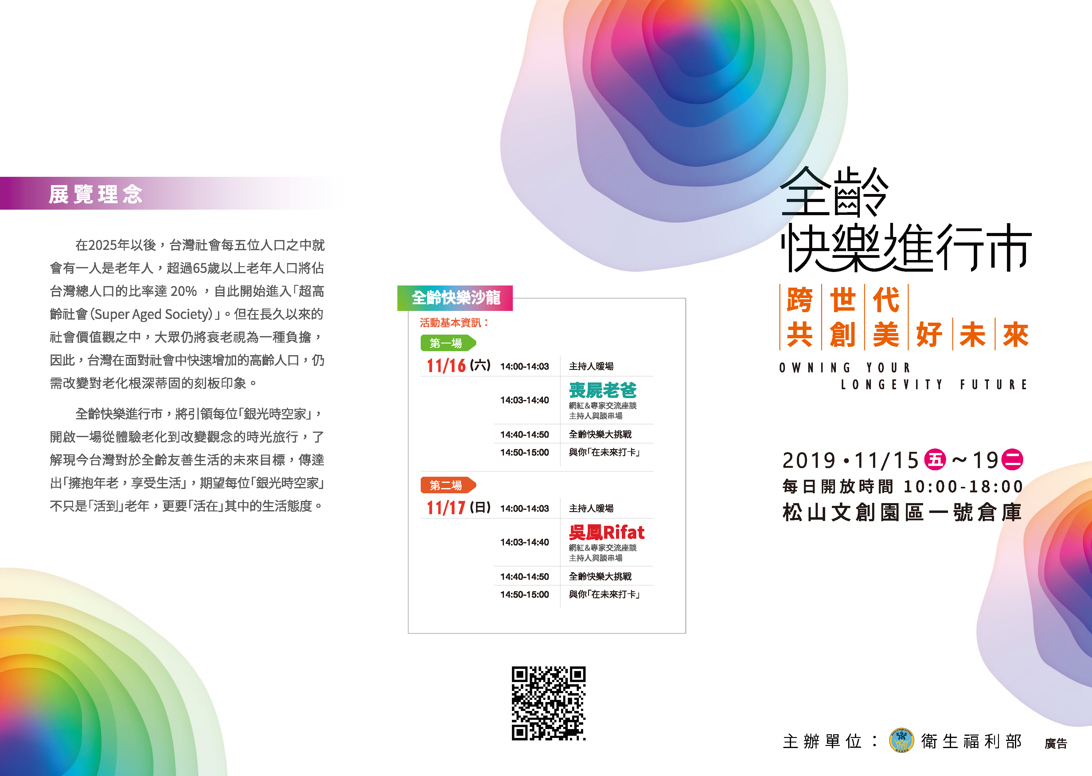 我國正面臨人口快速老化的挑戰,為呼籲大眾關心高齡化議題,一起思考、建構理想的高齡生活,本部於11月15日(週五)至11月19日(週二)假松山文創園區1號倉庫舉辦「全齡快樂進行市」展,邀請大家一起來體驗未來老化面對的高齡生活,並邀請知名網紅喪屍老爸、吳鳳分別與長照領域專家於展場現場與民眾交流座談,展覽期間,凡完成展場體驗活動的民眾都能參加幸運抽獎活動,摸彩獎項十分豐富,包括智慧手機、平板電腦、體重計、血壓計…等,歡迎大家踴躍參加試手氣!